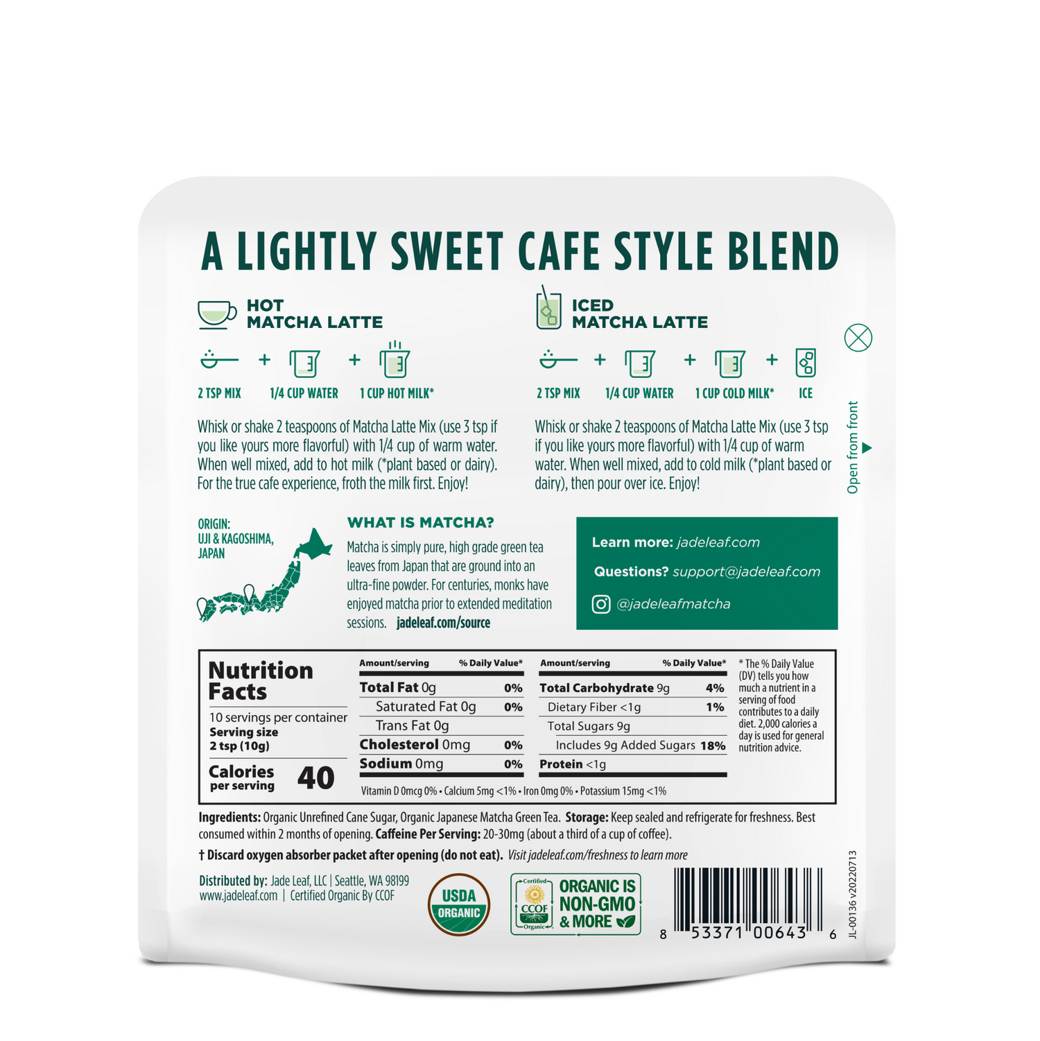 Organic Cafe Style Sweetened Matcha Latte Mix - Original 3.5oz (100g) Pouch